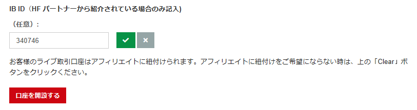HFパートナーから紹介されている場合は、IB IDの入力後にチェックボタンを押下します。