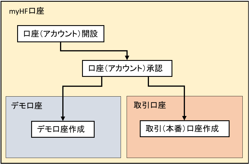 Hotforexの口座は以下の図のような構成になっており、取引可能になるまでにいくつかの手順が必要です。