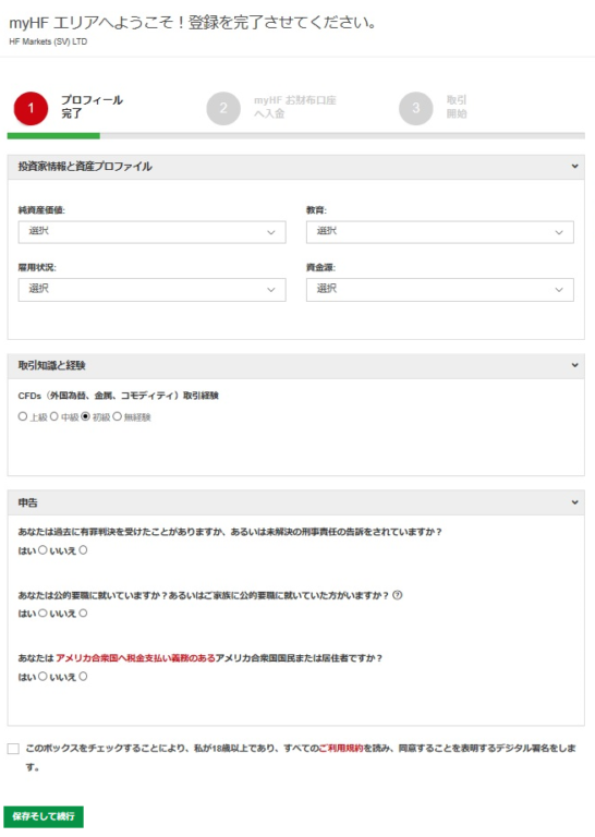 CFDs(外国為替、金属、コモディティ)取引経験をラジオボタンから選択します。
