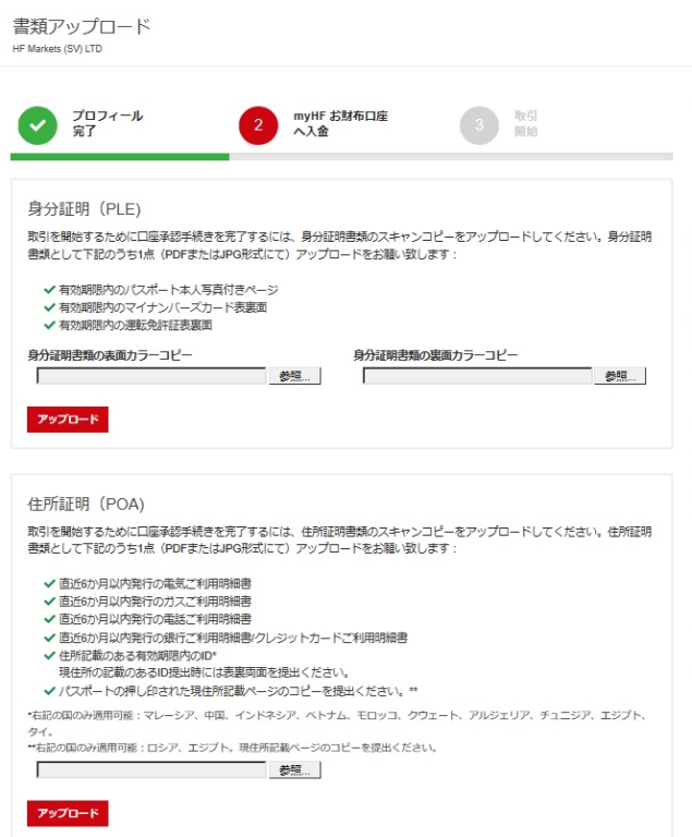 身分証明と住所証明のファイルを選択し、それぞれアップロードボタンを押下します。