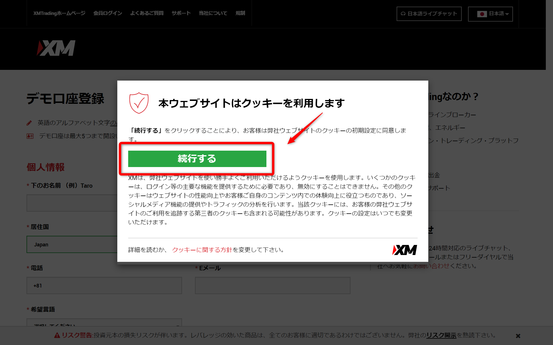 - クッキーの初期設定に同意し、「続行する」ボタンをクリックします。