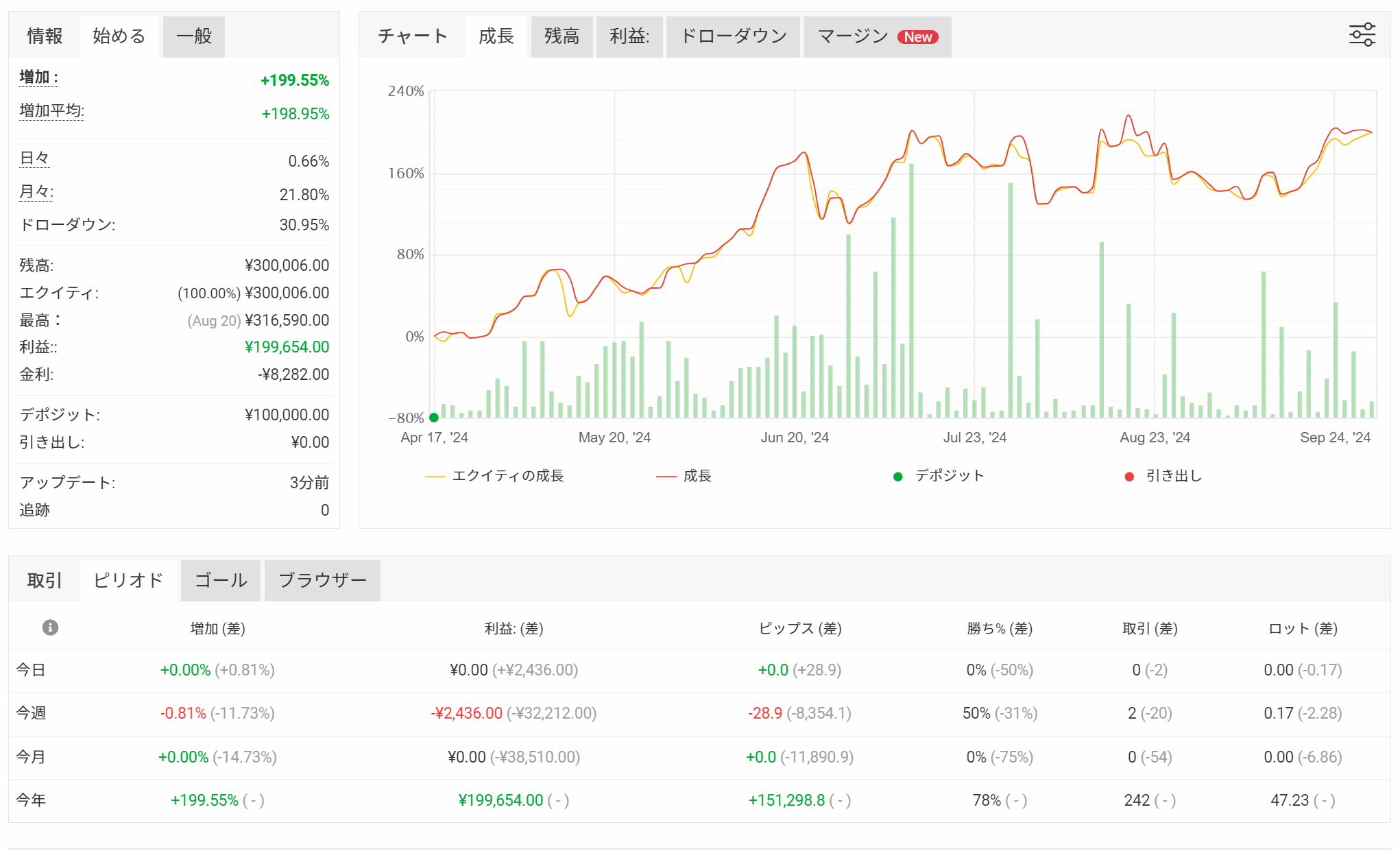直近、最高収益率を 2024/08/20に記録して以降は買ったり負けたりが続いている状態ですが、引き続き無理せず、無停止・放置で運用を続けていきたいと思います。