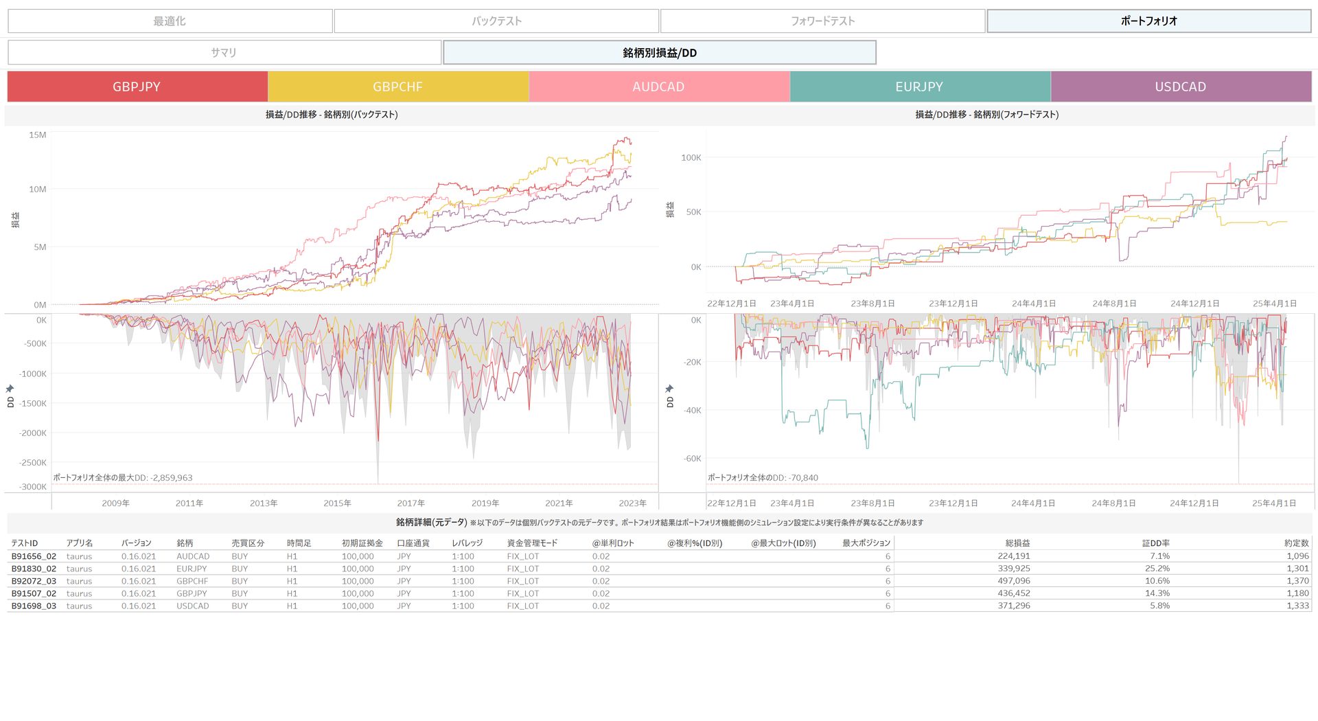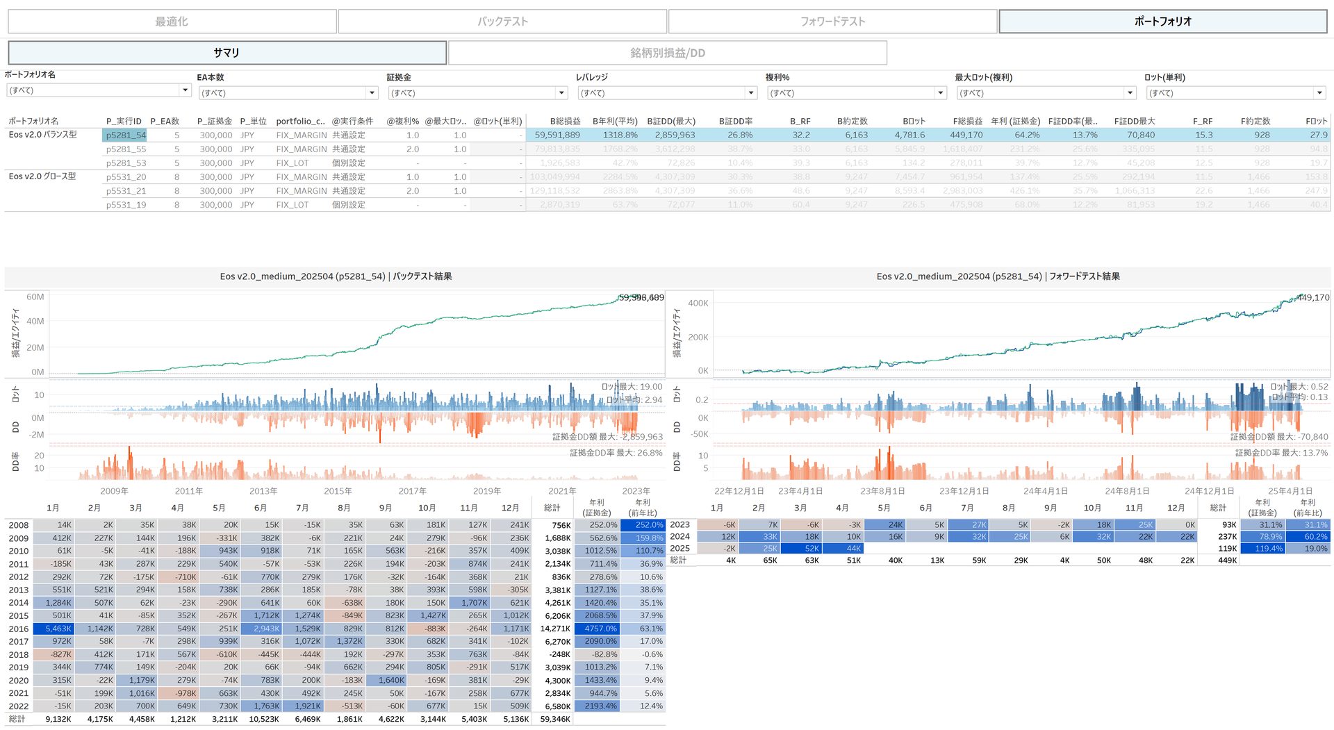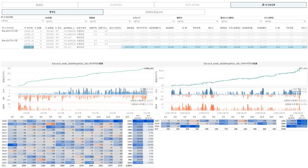 更に、EA毎の損益とドローダウンにおける相関性が低くなる運用パターンを自動計算する仕組み(=ポートフォリオ最適化機能)を構築し、大量のテスト結果からより良い運用パターンを自動抽出できるようにしました。