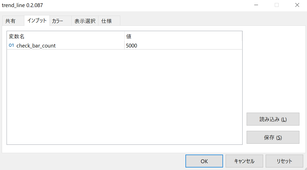 パラメータは1つのみ、ライン生成時に考慮するバー本数をしていすれば、その期間における長期/短期のトレンドラインを自動生成してくれます。とても簡単ですね。