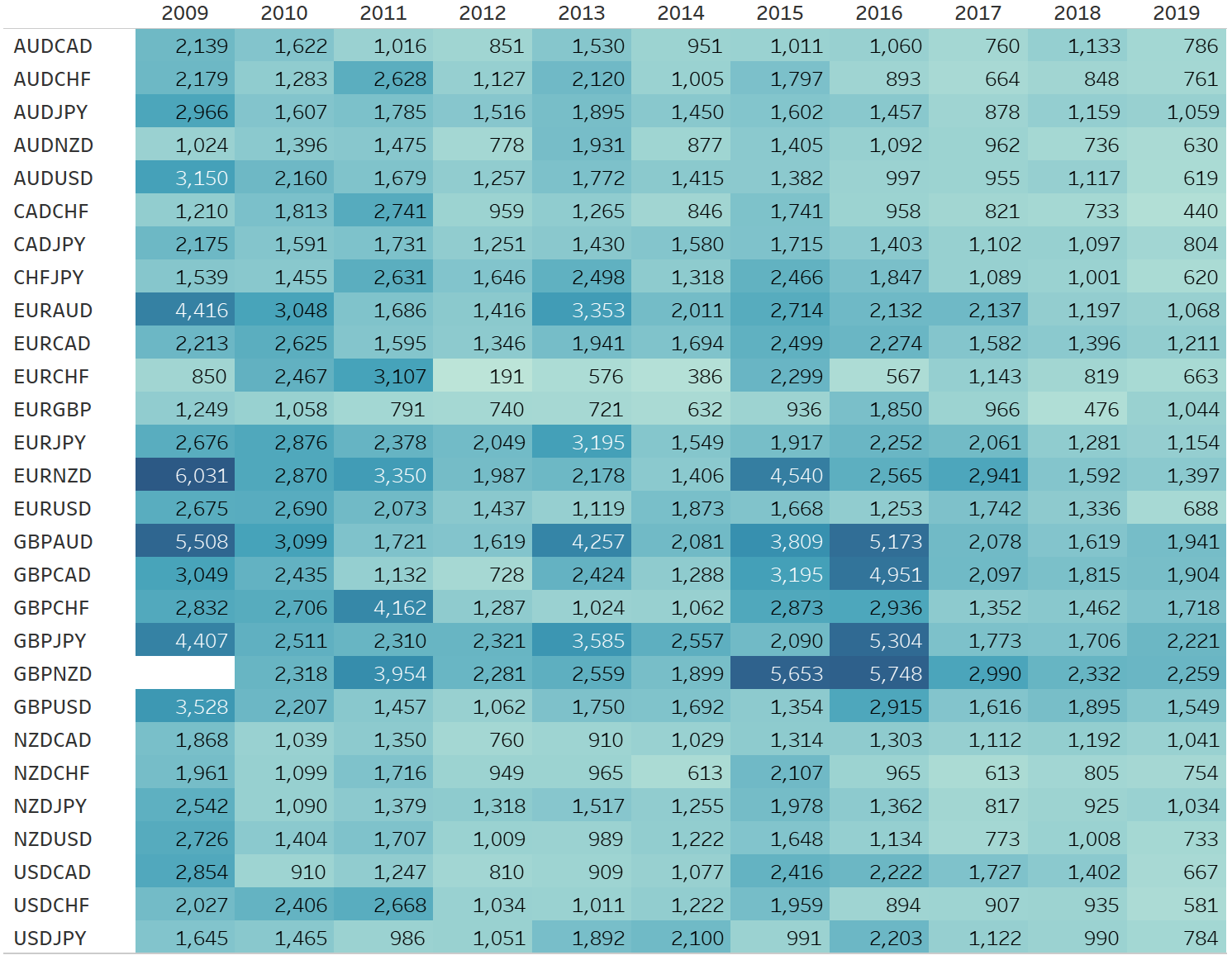 784pips という値は、年間ベースで見た場合、過去11年で最も小さい値でした。