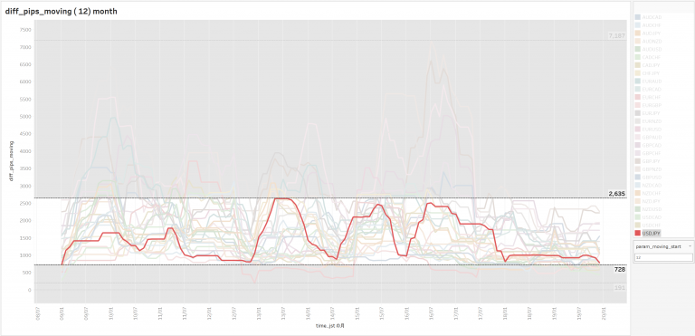 ナンピンの場合、初回ポジションを保有してからナンピンを重ね、全決済に至るまでの期間におけるレート幅がどの程度変動したか、の方が重要な指標となりますので、次は過去○ヶ月間のような移動計算をしてみます。