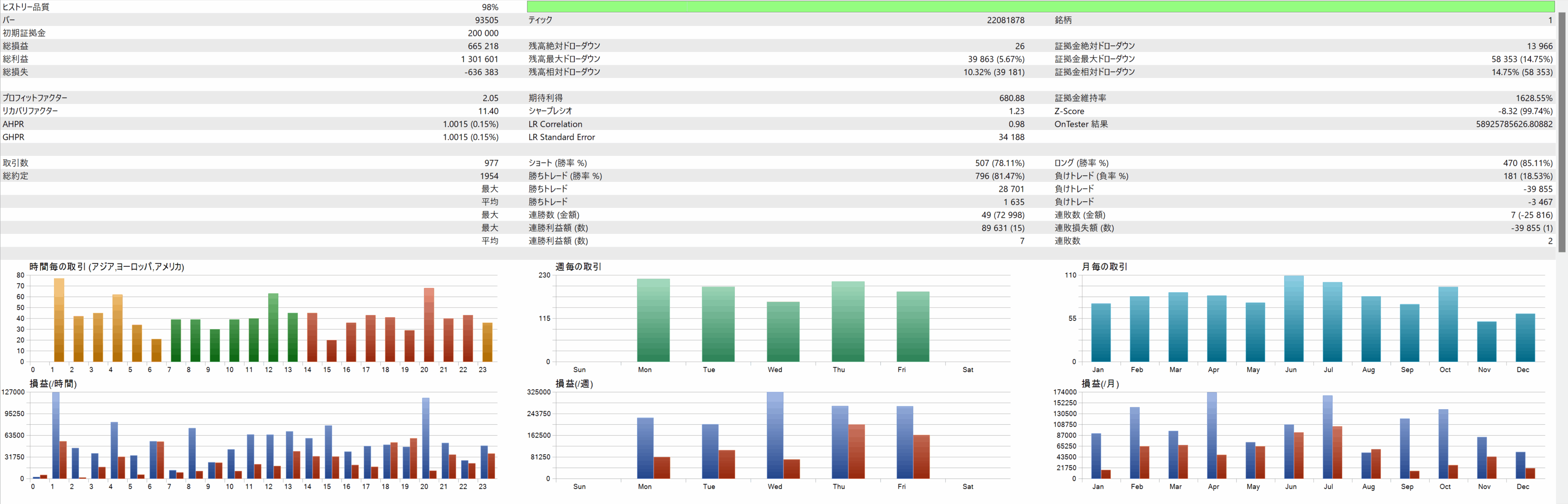 最適化は良いパフォーマンスを記録するパラメータを特定することが目的であるのに対して、バックテストは特定パラメータにおける詳細なトレード成績を得ることが目的です。