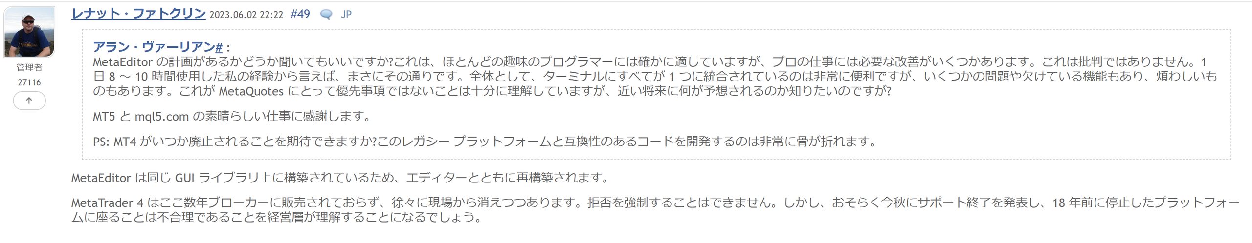 MetaTraderの開発を行っている MetaQuotes社 CEO Renat Fatkhullin 氏が、MQL5.comコミュニティ内でMT4ライセンスが既にブローカー向けに販売されていないことについて言及しています。