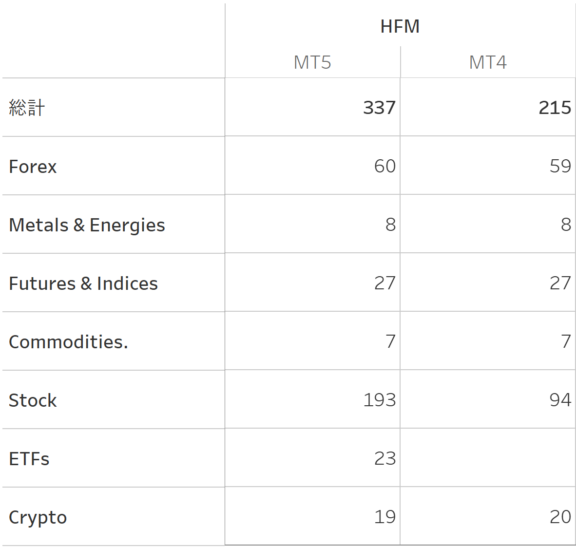 例として、証券会社HFMにおける、MT5(Premium口座)とMT4(Premium口座)の提供銘柄の差を比較してみました。