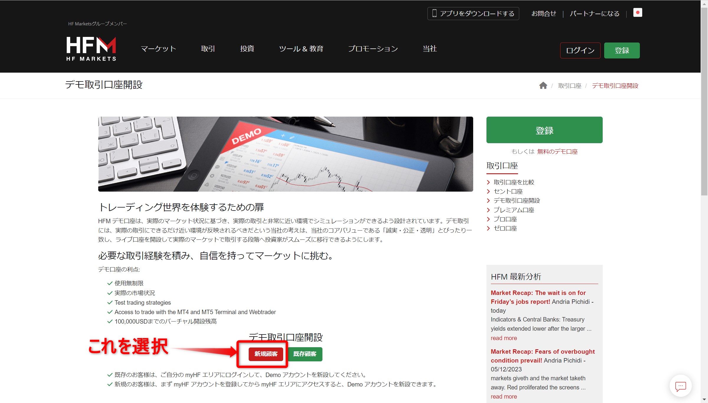 ①デモ取引口座開設| HFM にアクセスし新規顧客を選択します。