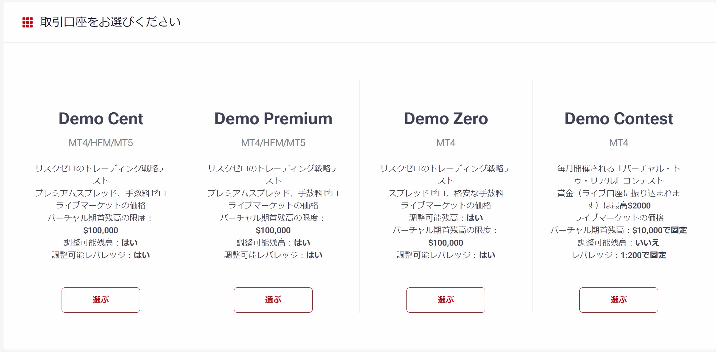 MT5の場合、セント口座(デモ)、プレミアム口座(デモ)の利用が可能です。