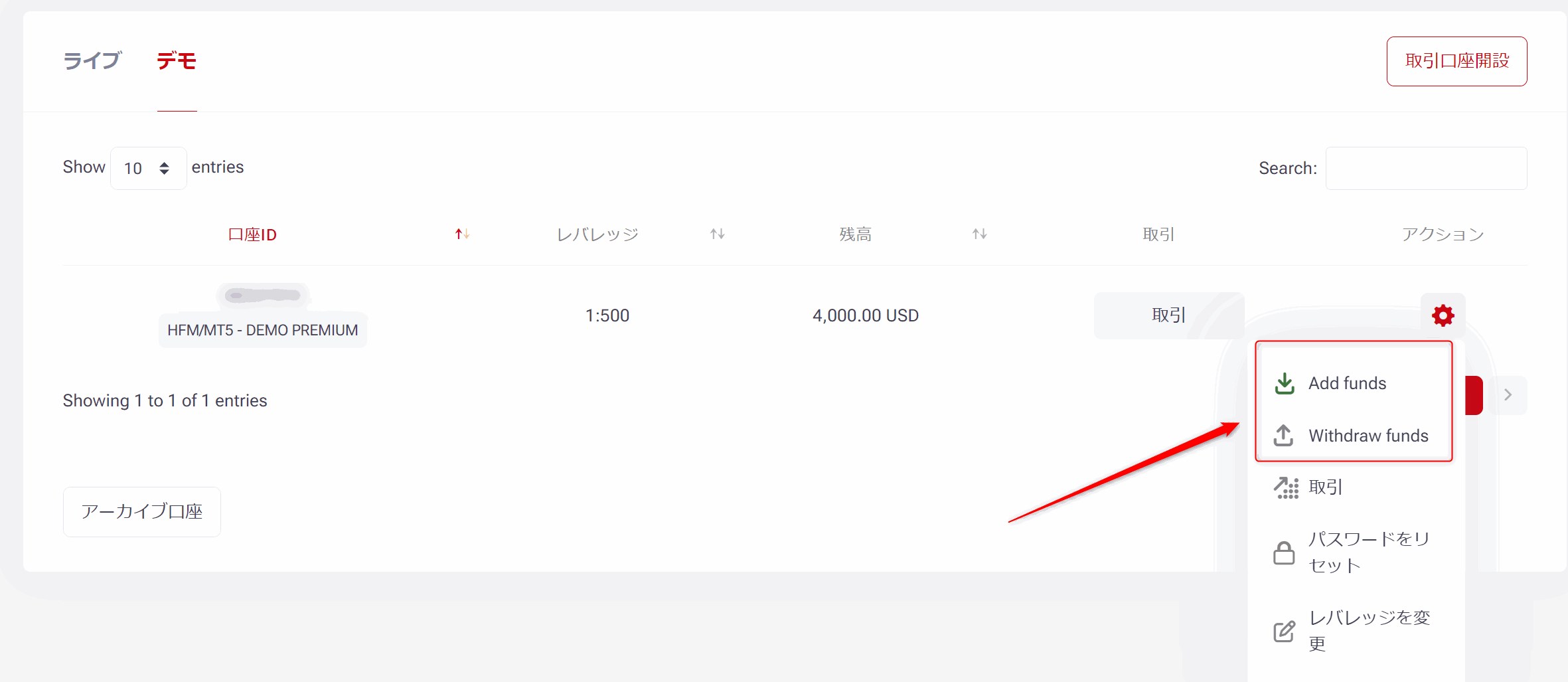 該当デモ口座の「アクション」メニューから、ご自身で設定が可能です。