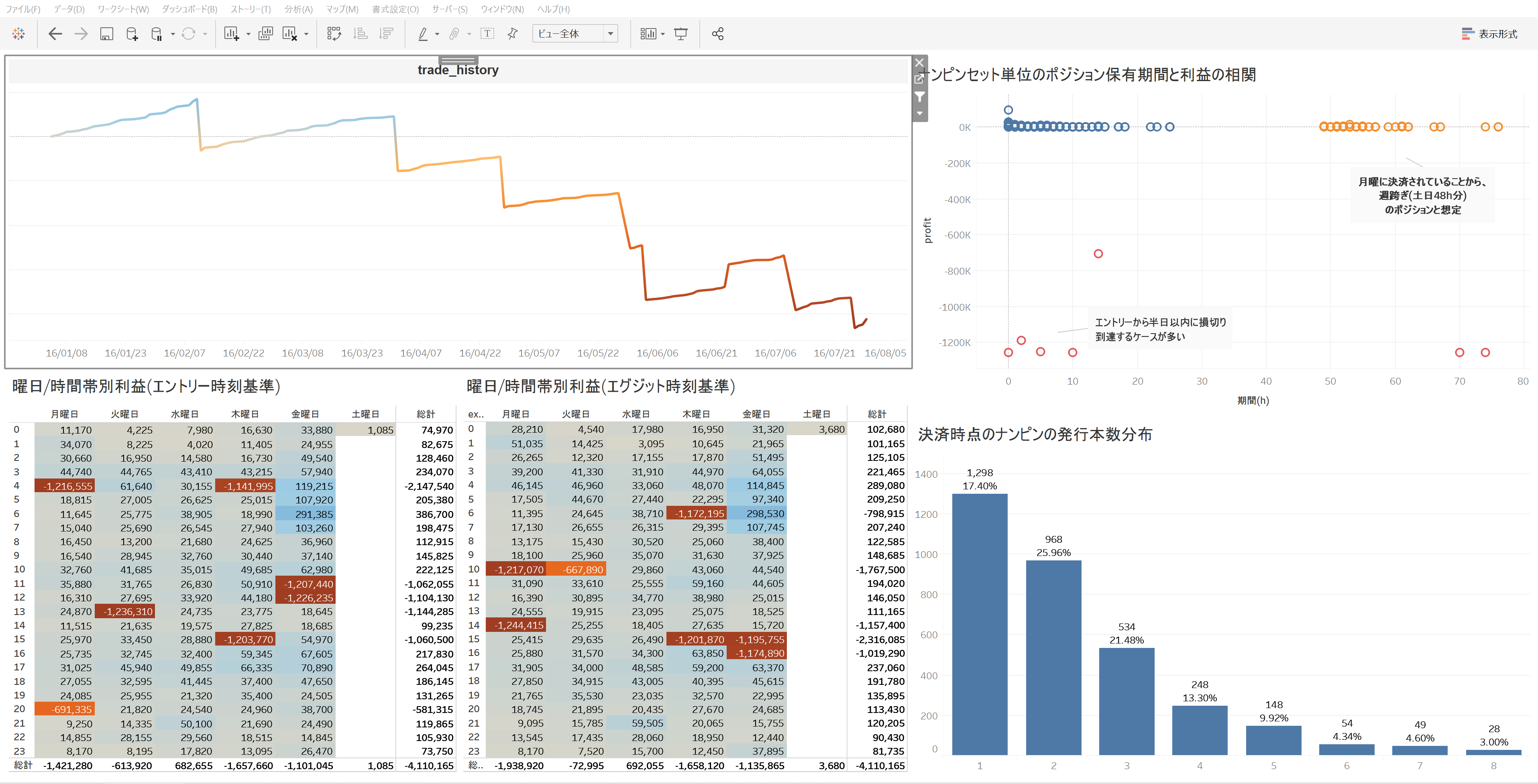 何曜日の何時頃の成績が良いか/悪いかが俯瞰できるだけでなく、クリックしたポイントの内訳がわかります。