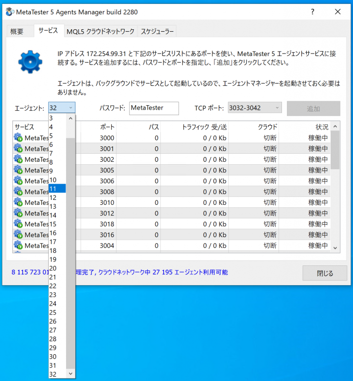次に、Threadripper 3970Xを搭載したPCをバックテスト専用の端末としてセットアップします。具体的には、MT5をインストールし、その後でテスト用のエージェントを起動するだけです。