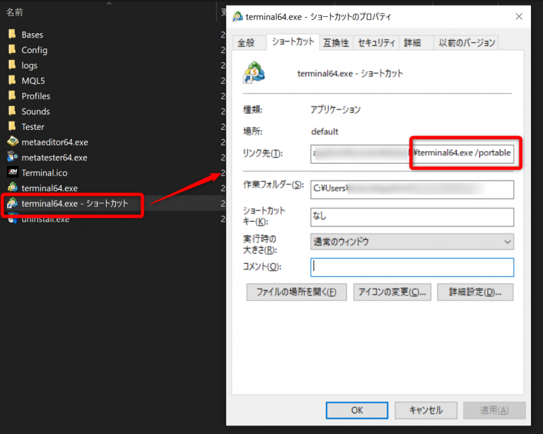 起動の度に /portable 引数雨を入力するのは手間がかかりますので、ショートカットファイルを作成し 「リンク先」に引数追加、ショートカットファイルからMT5を起動すれば運用の手間もありません。