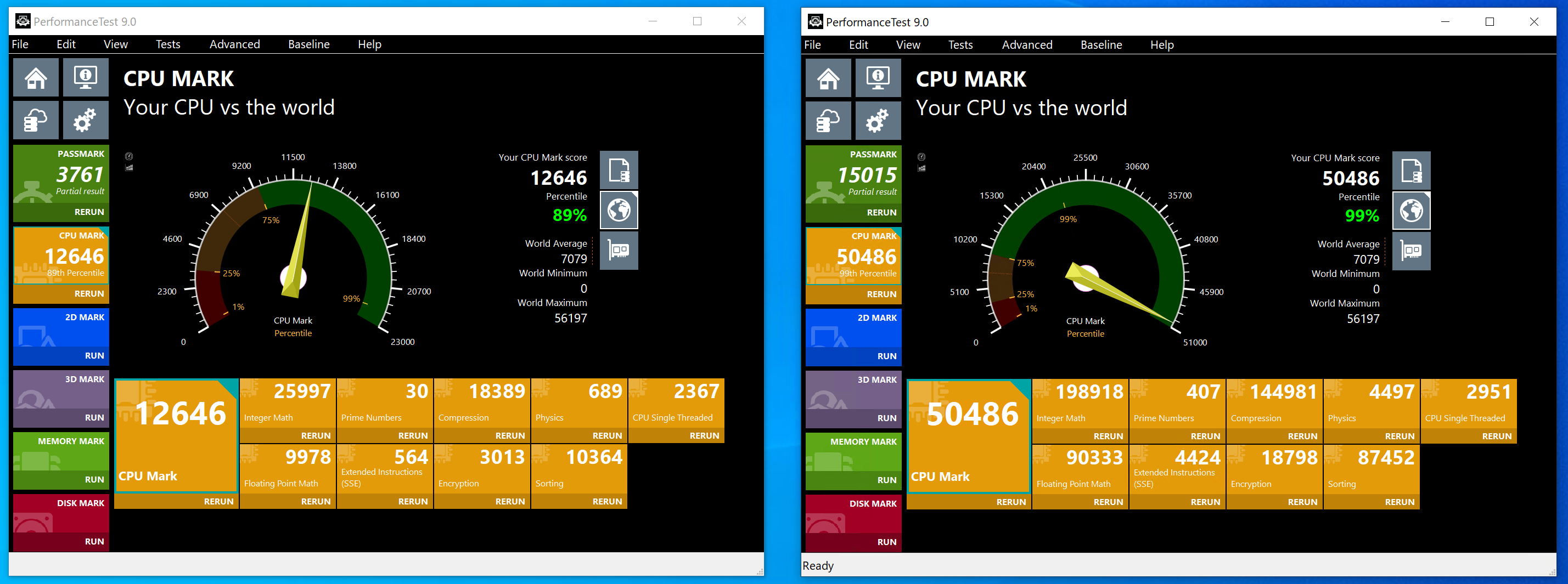 PassMarkのベンチマークソフトを用いて、私が所有する2台のPCのCPU性能を比較してみました。比較対象はIntel Xeon E-2176M(6コア12スレッド)とRyzen Threadripper 3970X(32コア64スレッド)です。