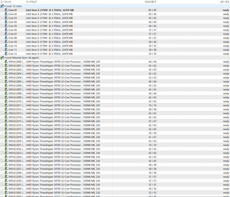 Xeon E-2176M のPCと 3970Xの2台をローカルネットワーク内に配置。 都合 12+64 = 76コア同時使用で最適化を行いましたが、