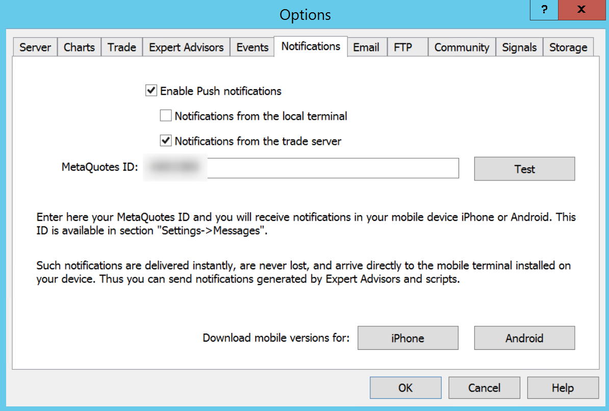 以前のバージョンでは、モバイルデバイスでの通知は、トレーダーのデスクトップターミナルからのみ配信できました。取引操作の実行時に、ターミナルは設定で指定されたMetaQuotes IDに関連する通知を送信し、通知は実行中のターミナルからのみ送信できました。この要件が解除され、コンピュータの電源がオフのときにサーバでTPがトリガーされると、サーバからポジション決済に関する通知が届きます。