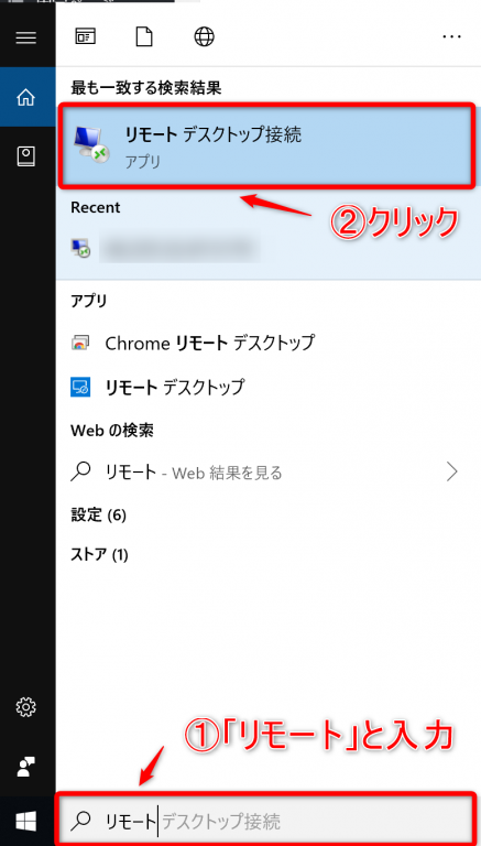 - 検索結果の中から、「リモートデスクトップ接続」をクリックします。