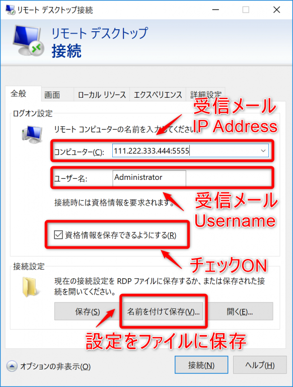 - VPS提供元のBeeks Financial Cloud社から届いたメールに記載されている接続情報を設定画面に入力します。