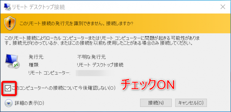 「このコンピュータへの接続について今後確認しない」にチェックを入れ、「接続」ボタンを押下します。