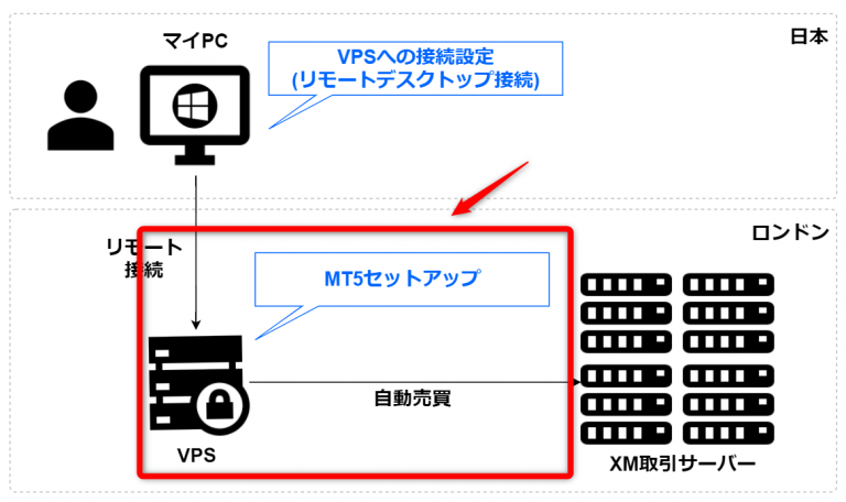 この用意されたVPSに、MT5環境を準備し、そこにEAを配置。パラメータなど必要な設定をして、24時間売買を開始することができます。